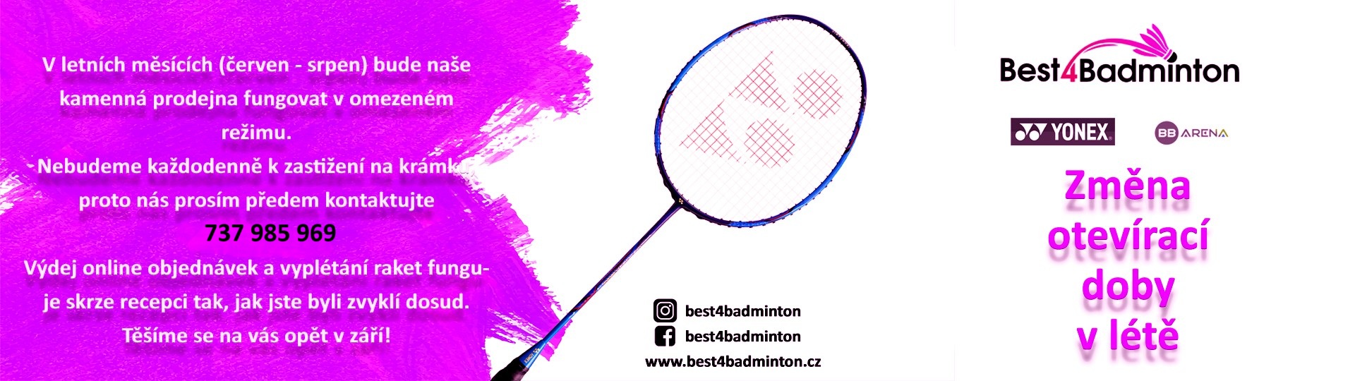 Pokud chcete poradit s výběrem, neváhejte napsat, nebo se za námi stavte v naší kamenné prodejně v BB Areně v Letňanech, kde také provozujeme oficiální Yonex testovací raketové centrum. Precizní vyplétací servis je samozřejmostí.